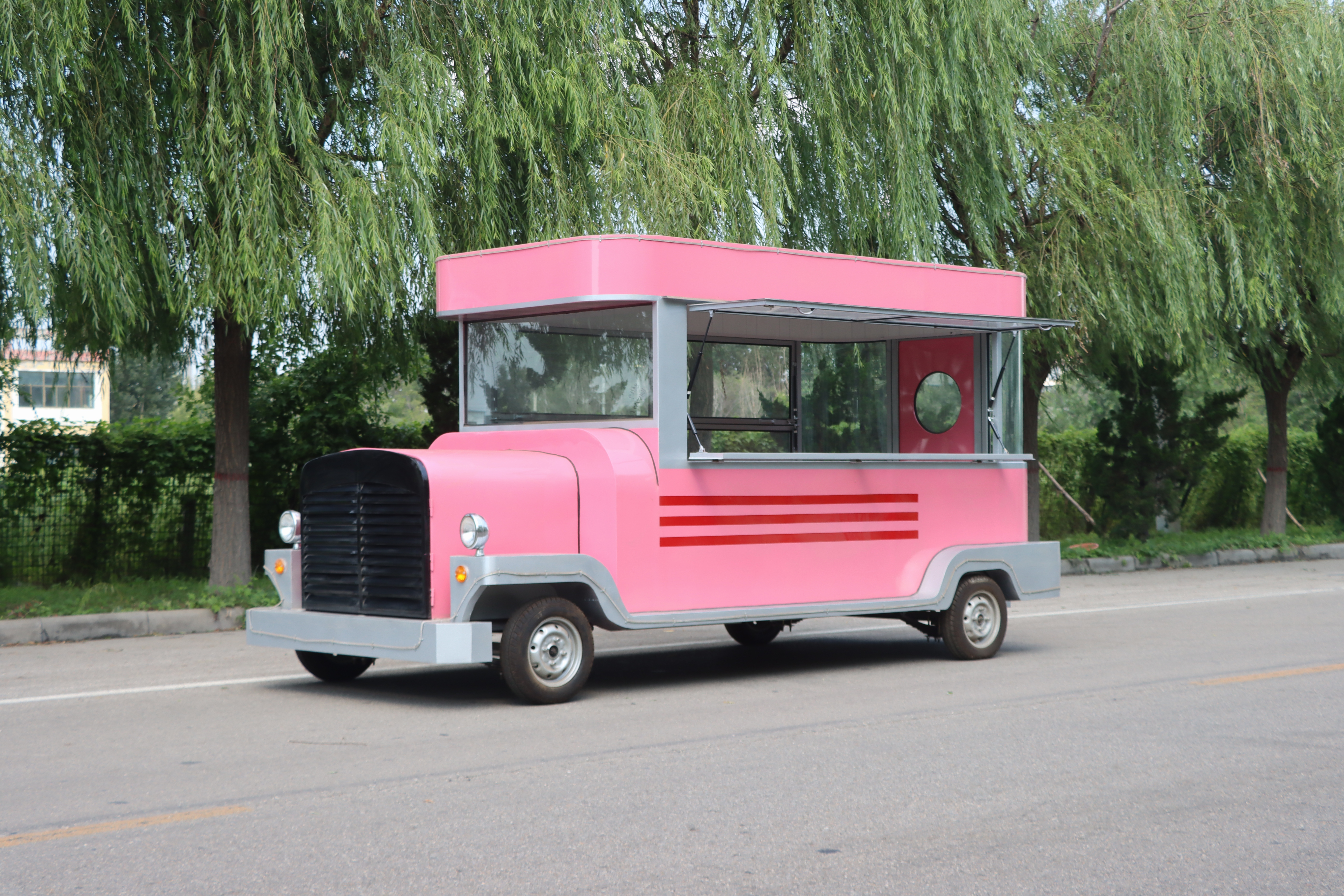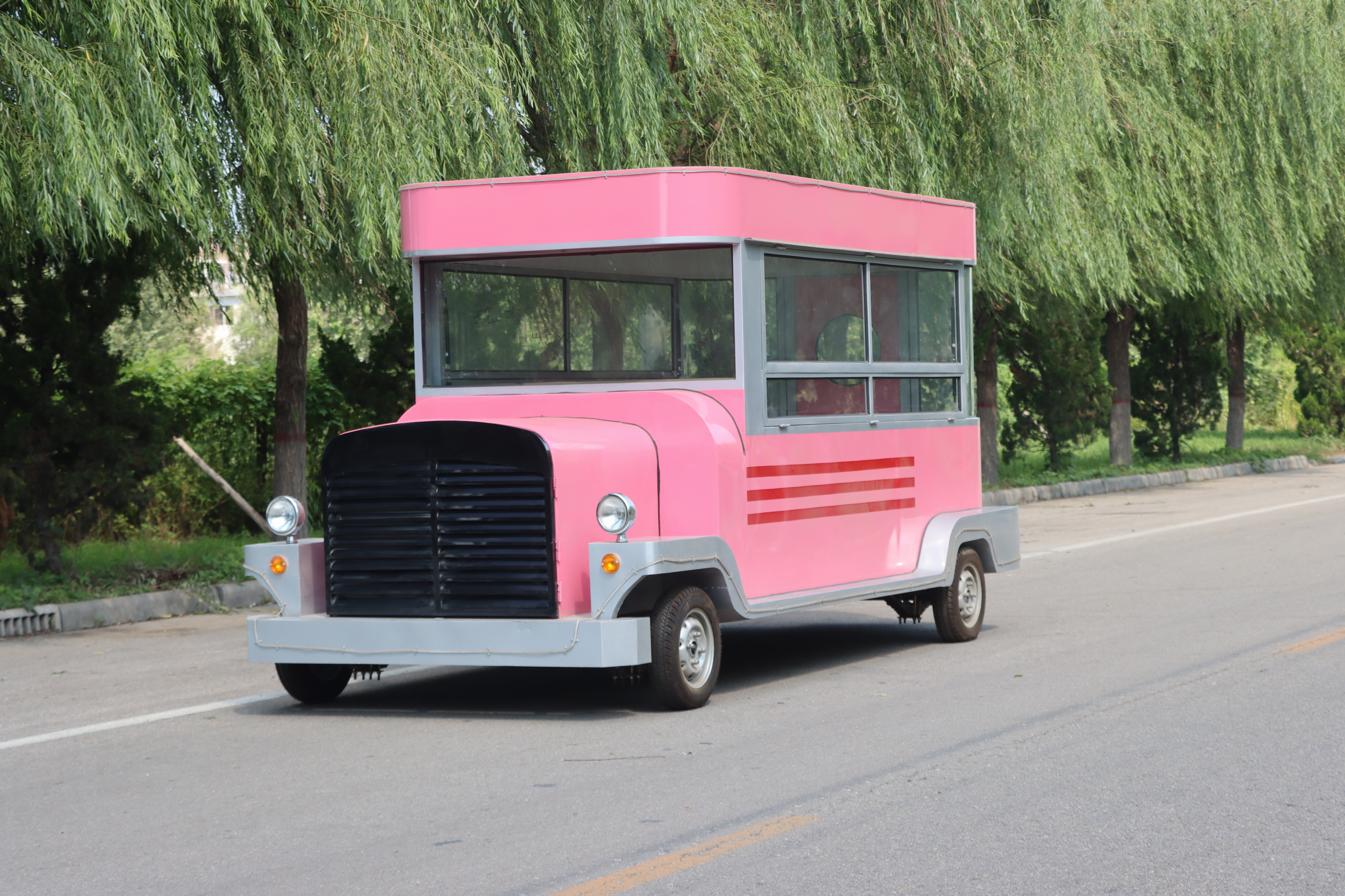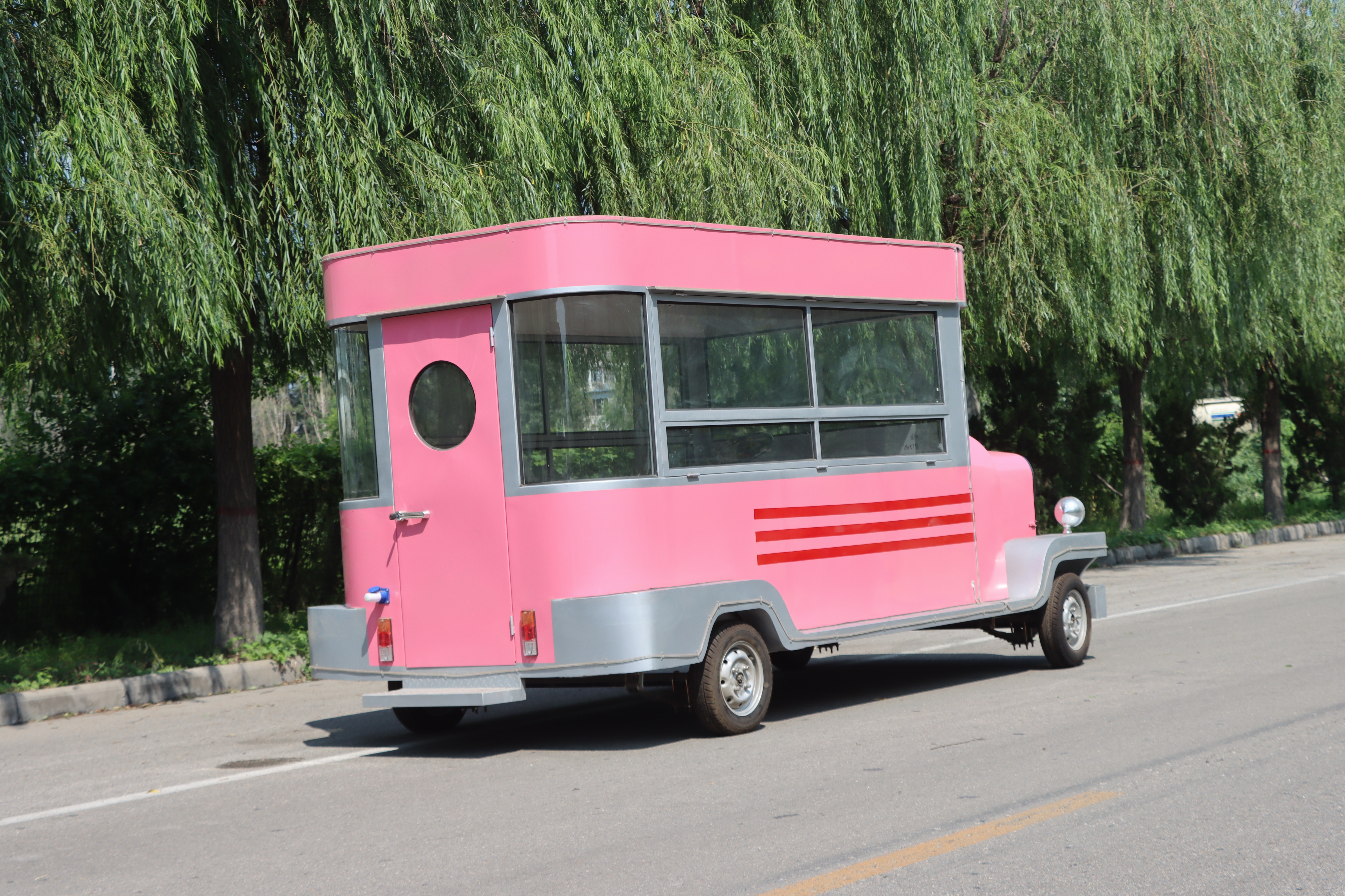 这款粉色老爷餐车,无疑是一道亮丽的风景线,以其复古而又不失可爱的设计,瞬间吸引路人的目光。车身的主色调是温柔的粉色,仿佛一抹甜美的梦境,穿梭在现实与幻想之间。粉色的车身上,巧妙地融入了灰色的装饰条纹,为整体增添了几分经典与雅致。
