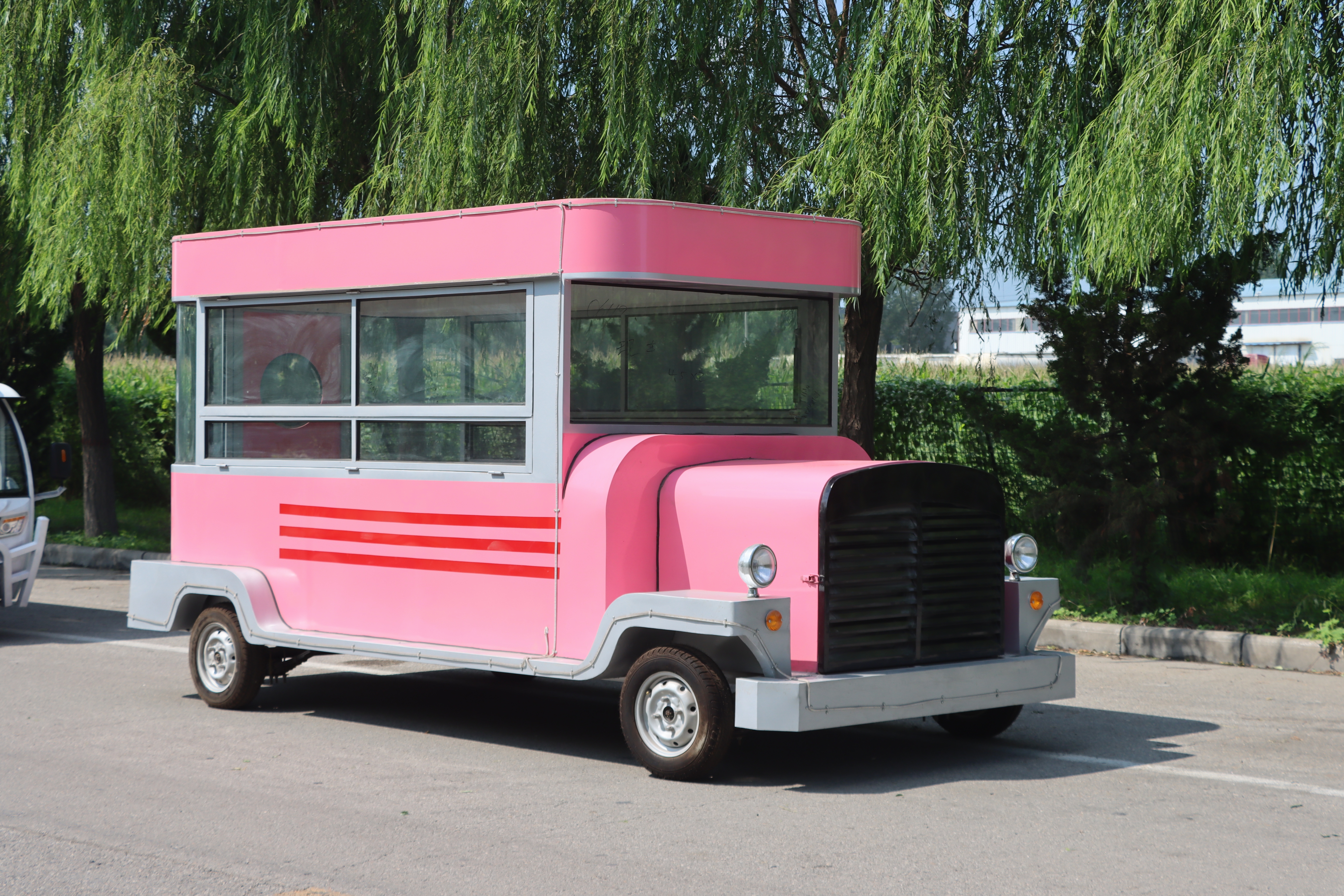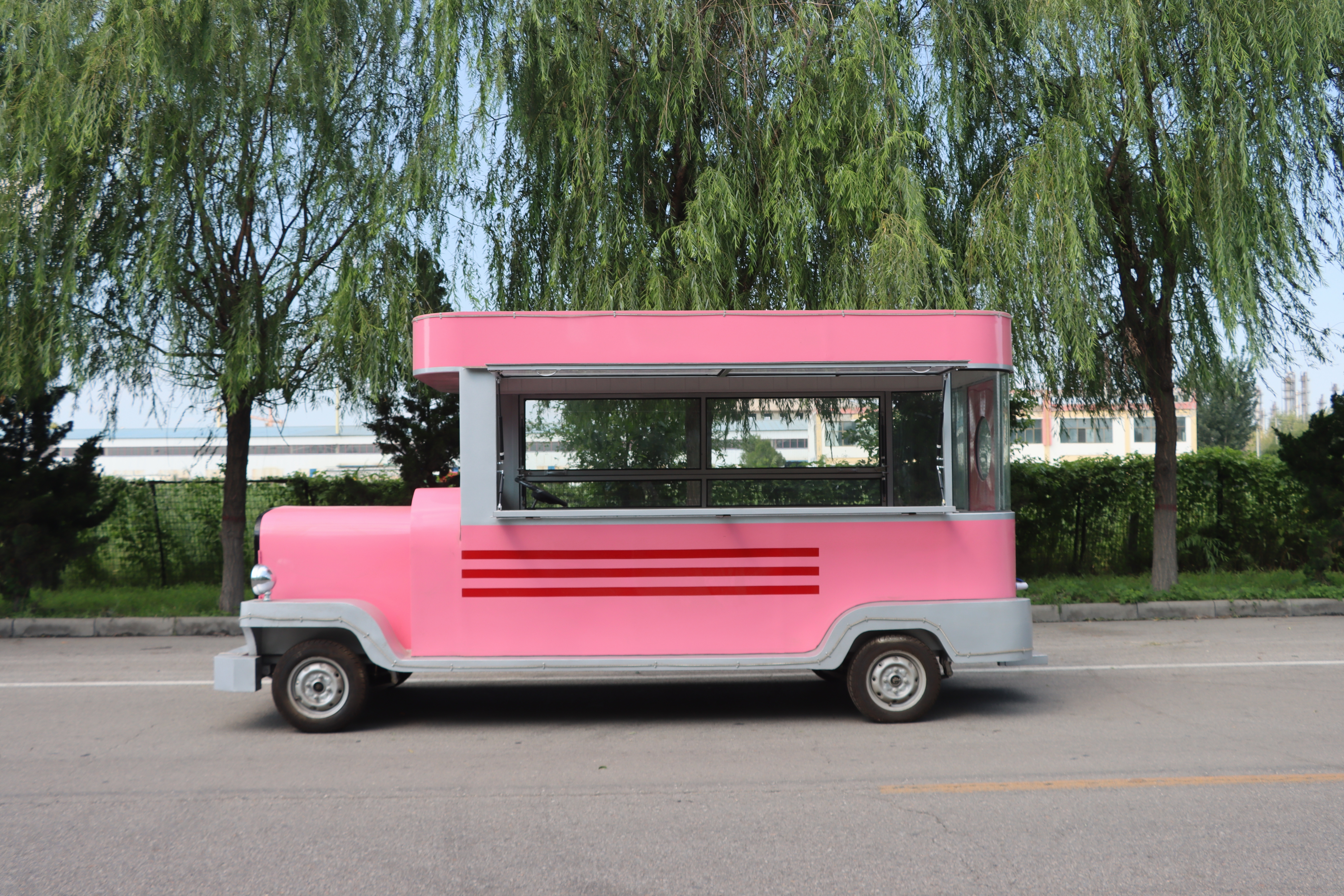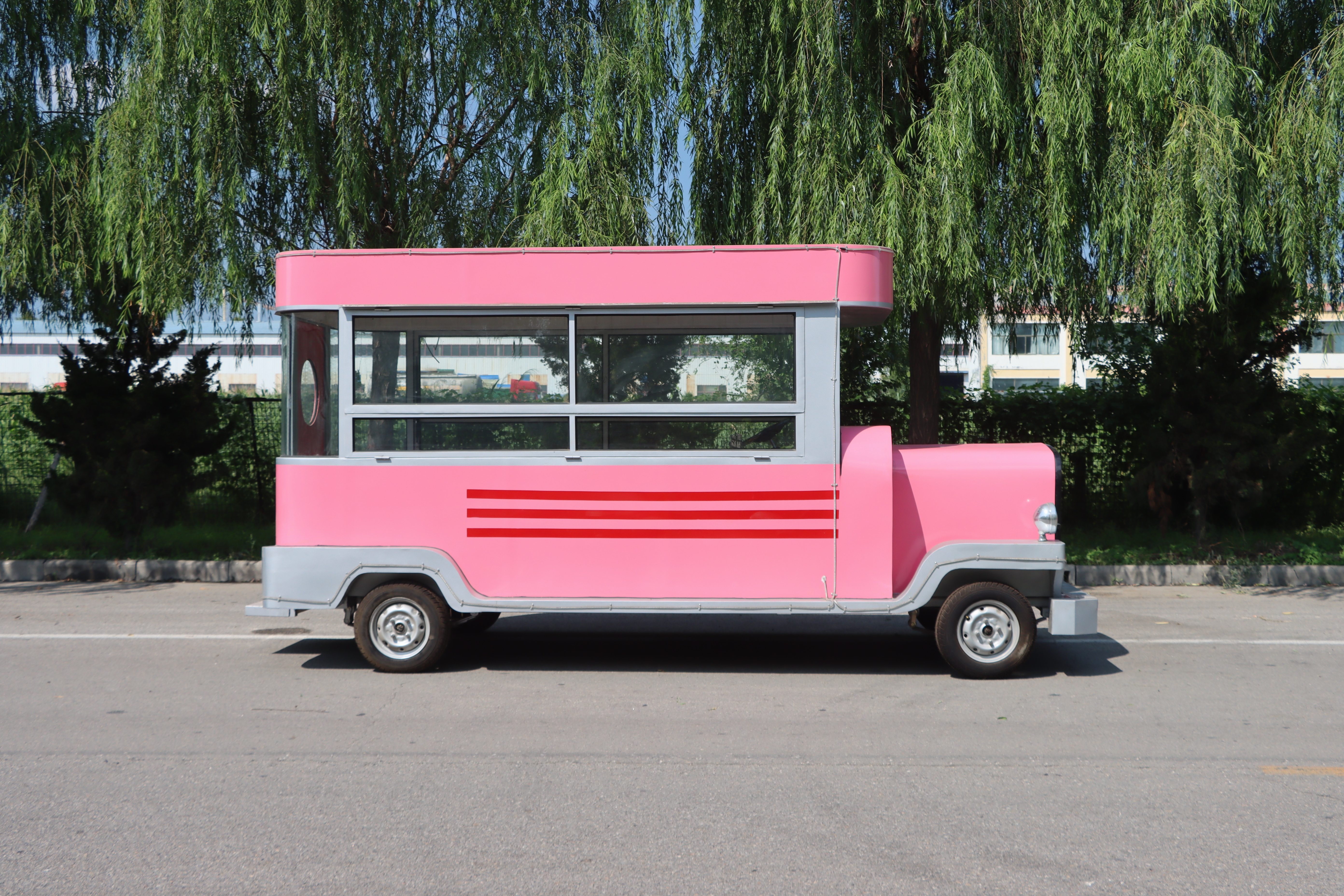 这款粉色老爷餐车,无疑是一道亮丽的风景线,以其复古而又不失可爱的设计,瞬间吸引路人的目光。车身的主色调是温柔的粉色,仿佛一抹甜美的梦境,穿梭在现实与幻想之间。粉色的车身上,巧妙地融入了灰色的装饰条纹,为整体增添了几分经典与雅致。